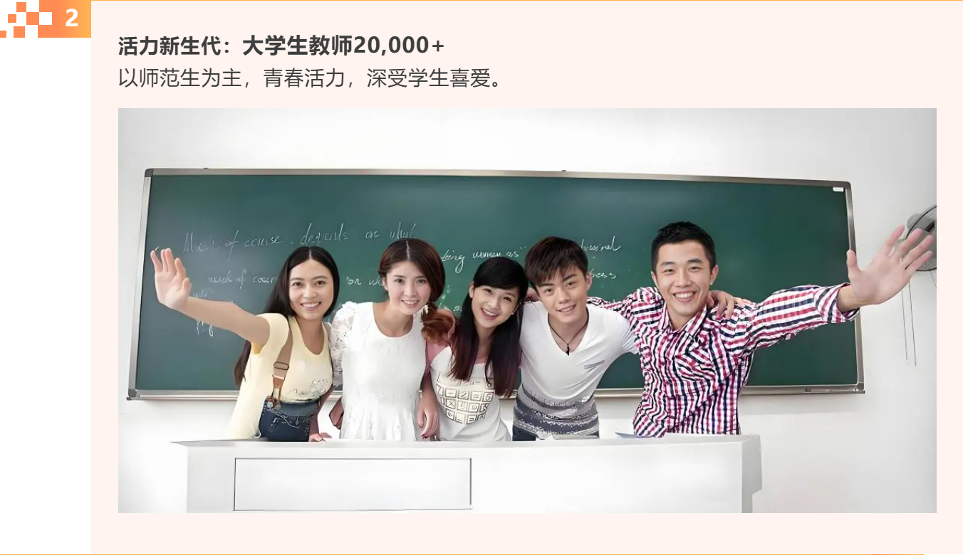 2018 定位教育人力资源科技公司,研发教育人才精准匹配系统,课后服务升级为行业标杆;合作校突破100所。