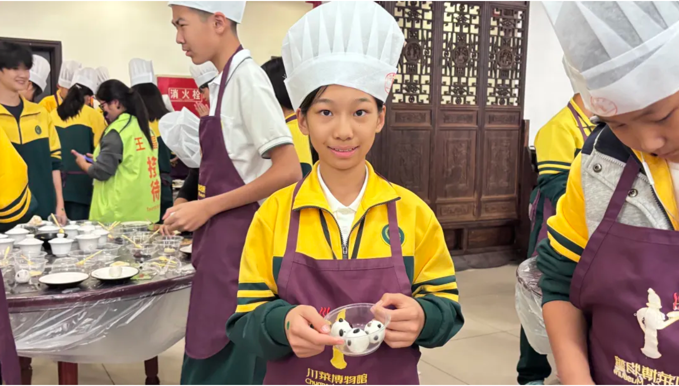 川菜博物馆里,一场美食与文化的盛宴拉开帷幕。学生们不仅了解了川菜的发展历程、特色风味和烹饪技巧,还亲自参与了熊猫包和锅盔的制作。在专业师傅的指导下,大家揉面、包馅、塑形,忙得不亦乐乎。当看到自己亲手制作的美食出炉时,学生们的脸上洋溢着自豪的笑容。品尝着自己的劳动成果,大家对川菜文化有了更深刻的认识和体验。