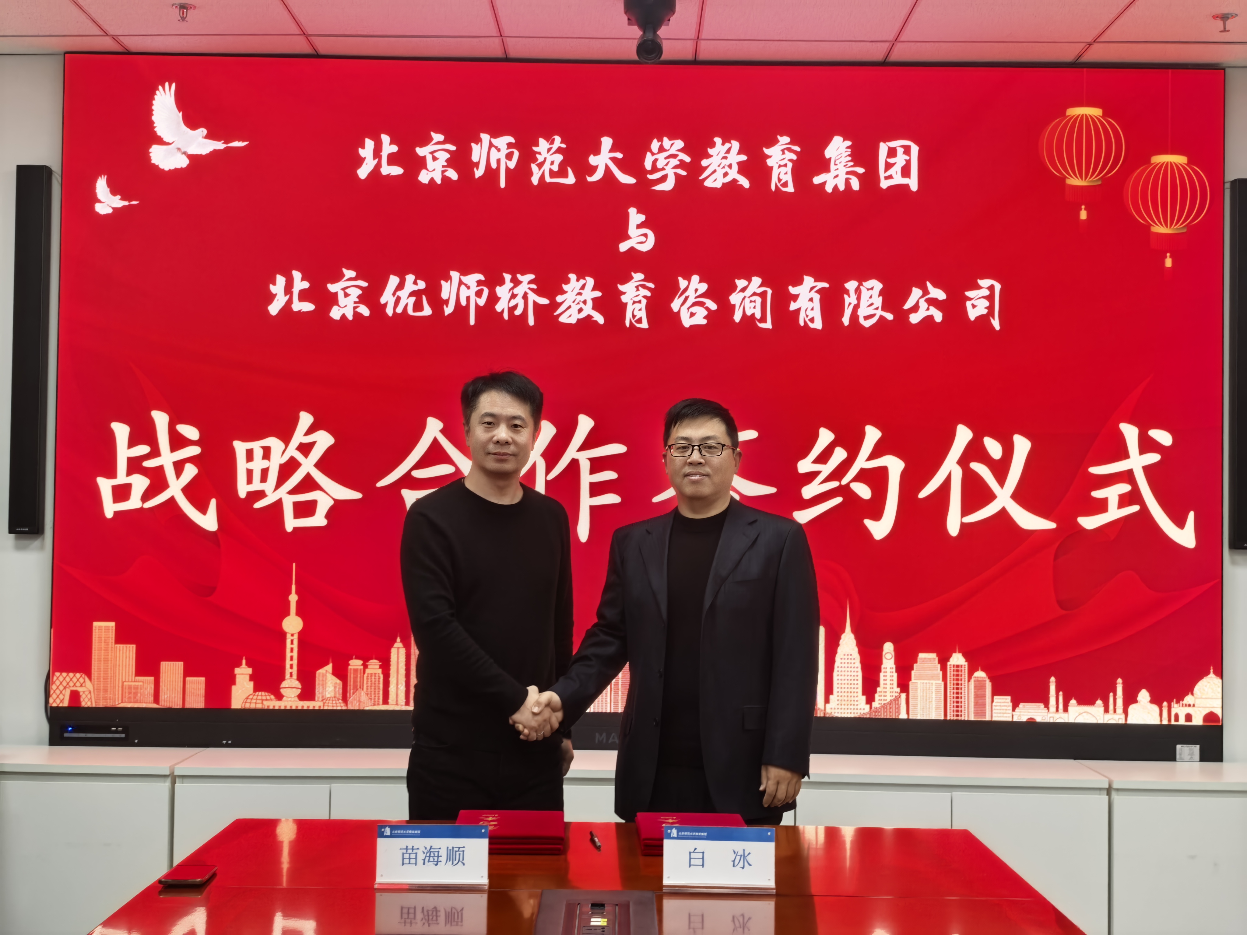 近日,北京师范大学教育集团与国内基础教育人才服务领域头部企业北京优师桥教育咨询有限公司在京正式签署战略合作协议,开启顶尖师范教育研究力量与优质教育实践平台深度协同、聚力创新的新篇章。北师大教育集团副总裁白冰、学生素养业务负责人陈雨竹,优师桥董事长苗海顺、总经理高向军、副总经理刘晨明、高级顾问张波等双方核心代表出席签约仪式,共同见证此次合作落地。
